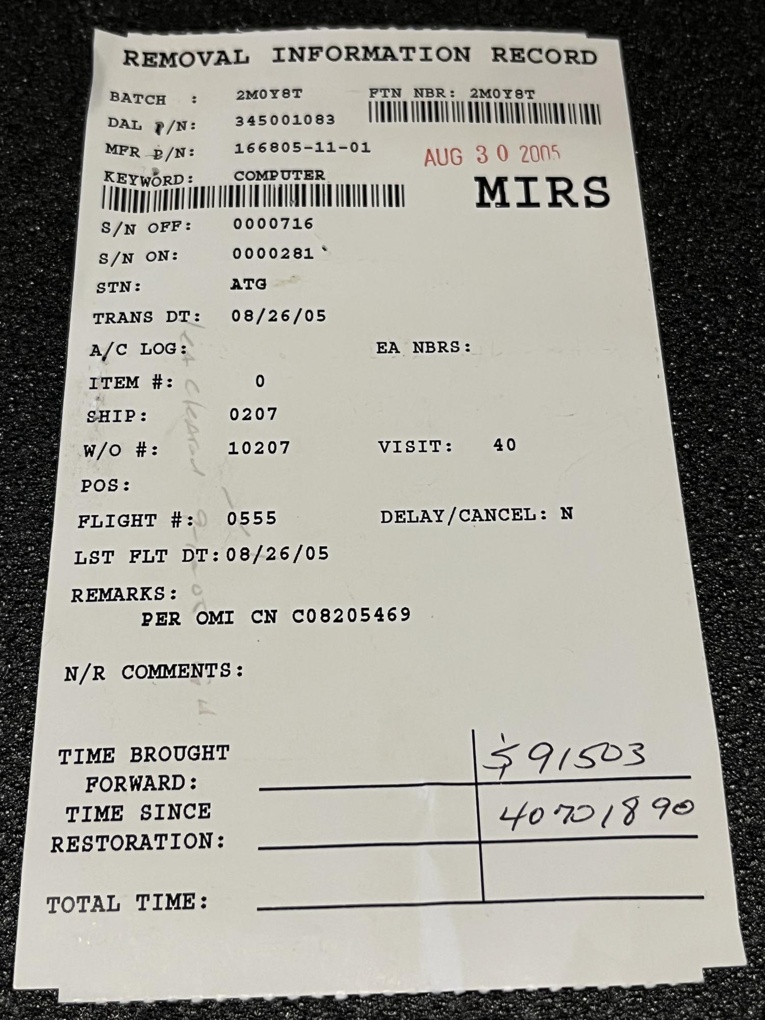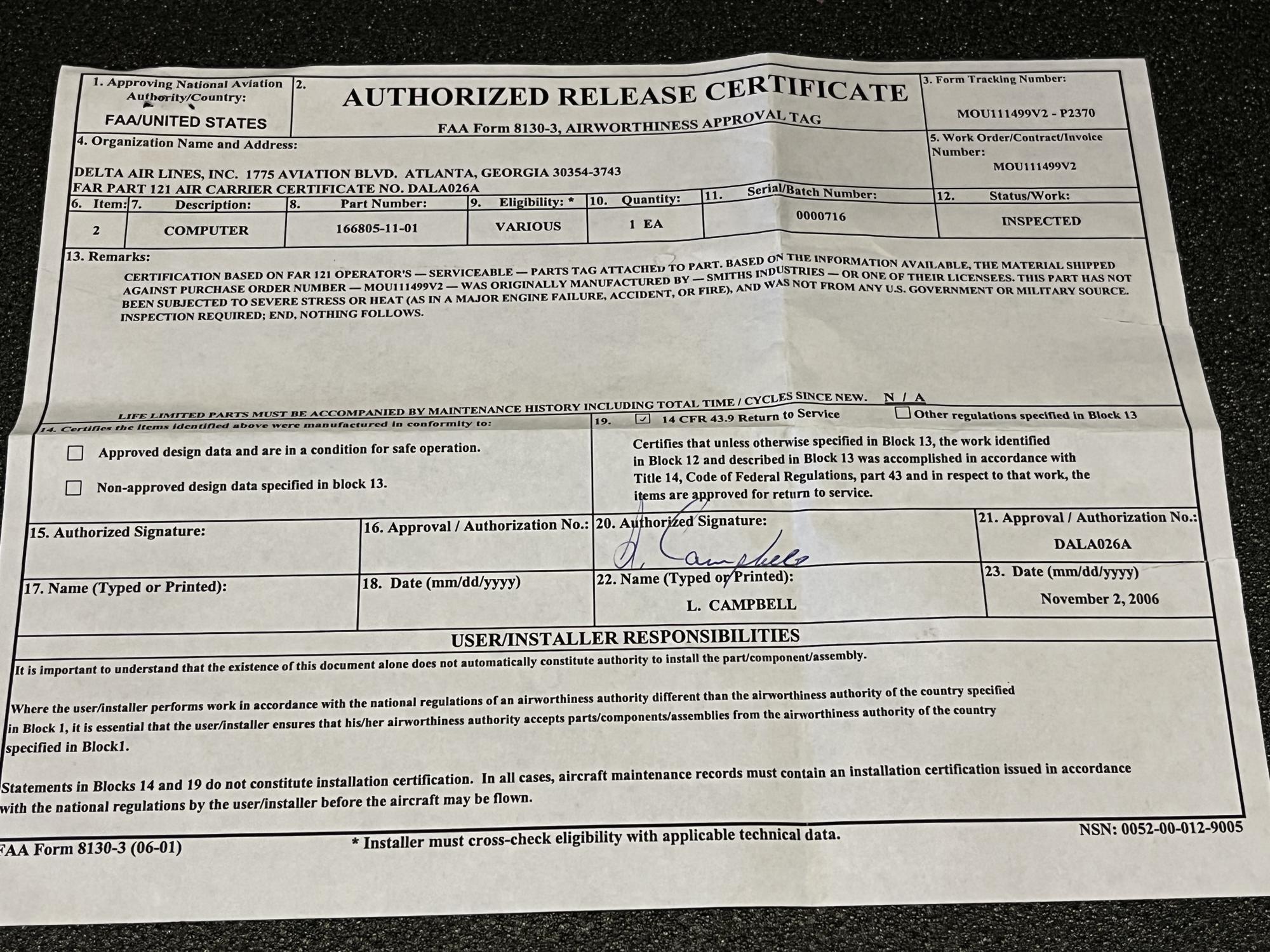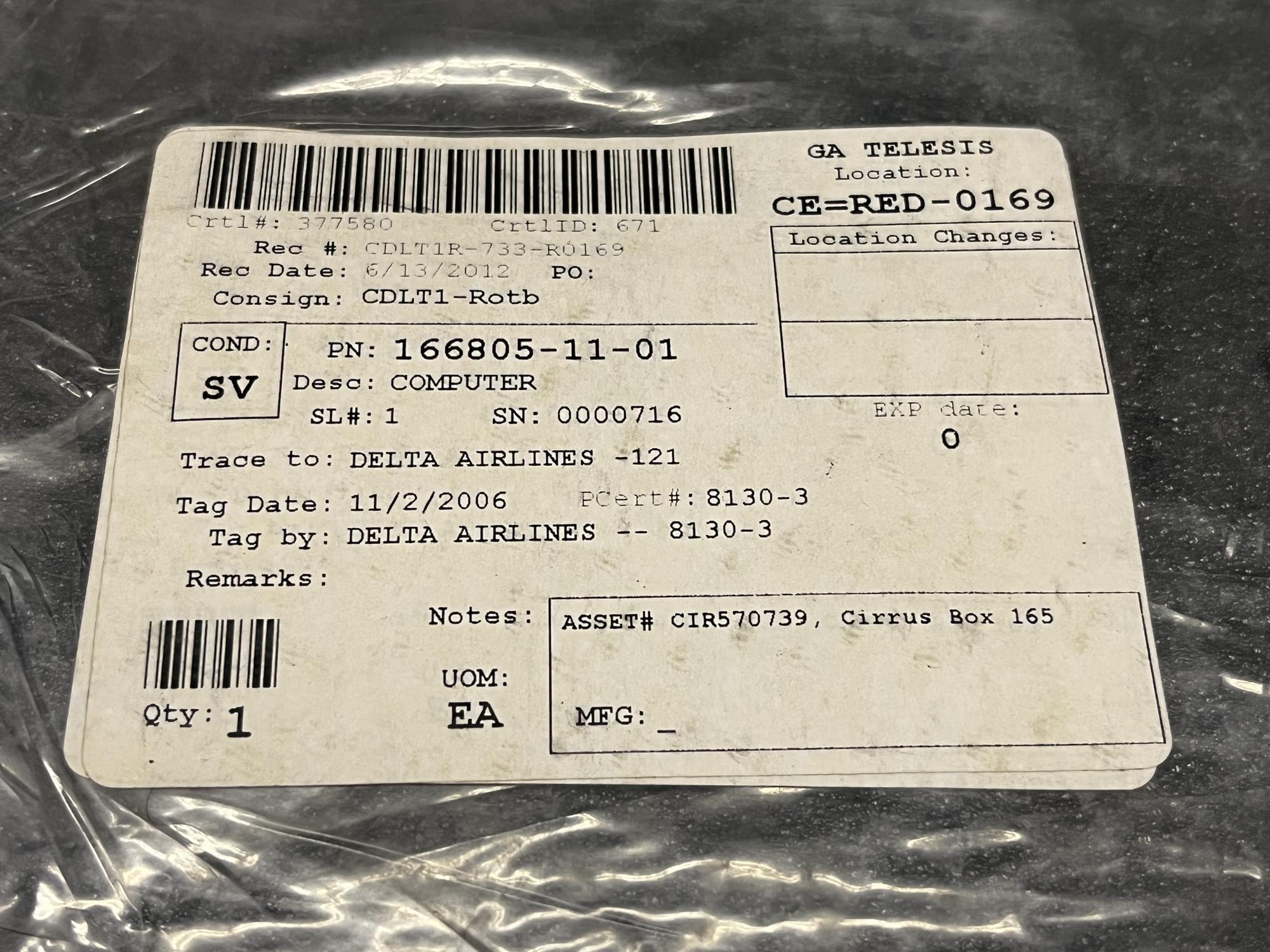 | 105 | 166805-11-01 | 0000716 | COMPUTER | 1 | SV | B737 | CDLT1-ROTB | SID01347 | View |