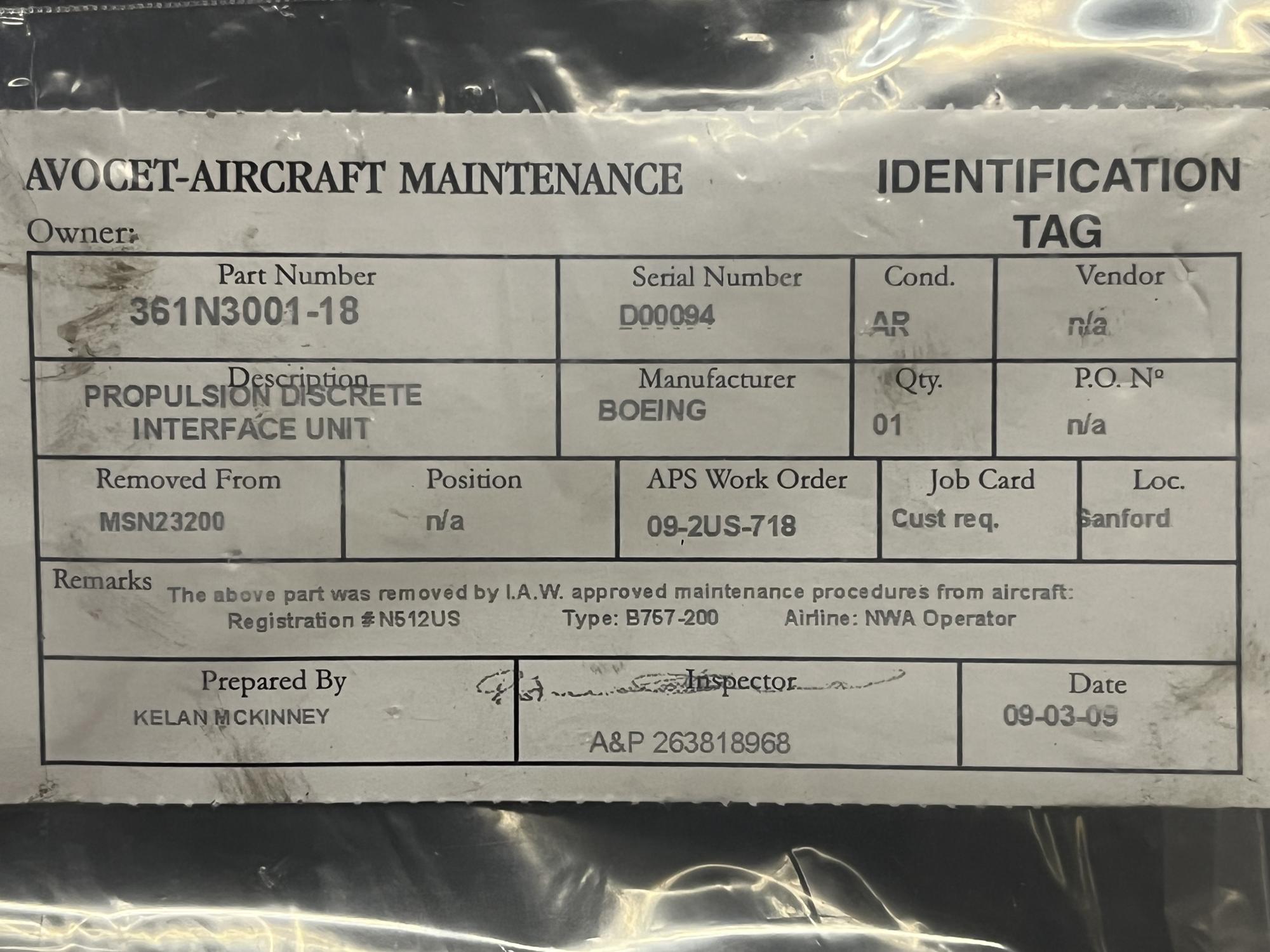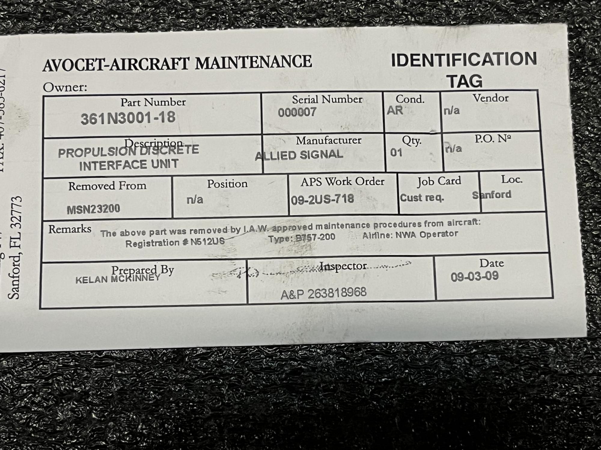| 151 | 361N3001-18 | 000007 | UNIT, INTERFACE | 1 | AR | B757 | A23200 | SID08510 | View |