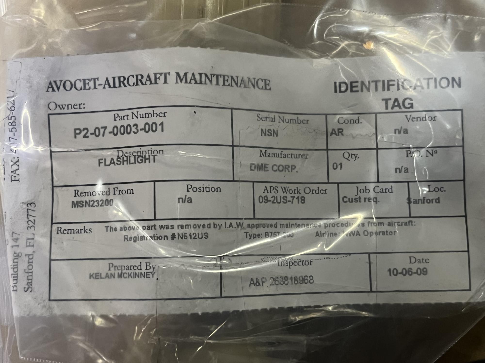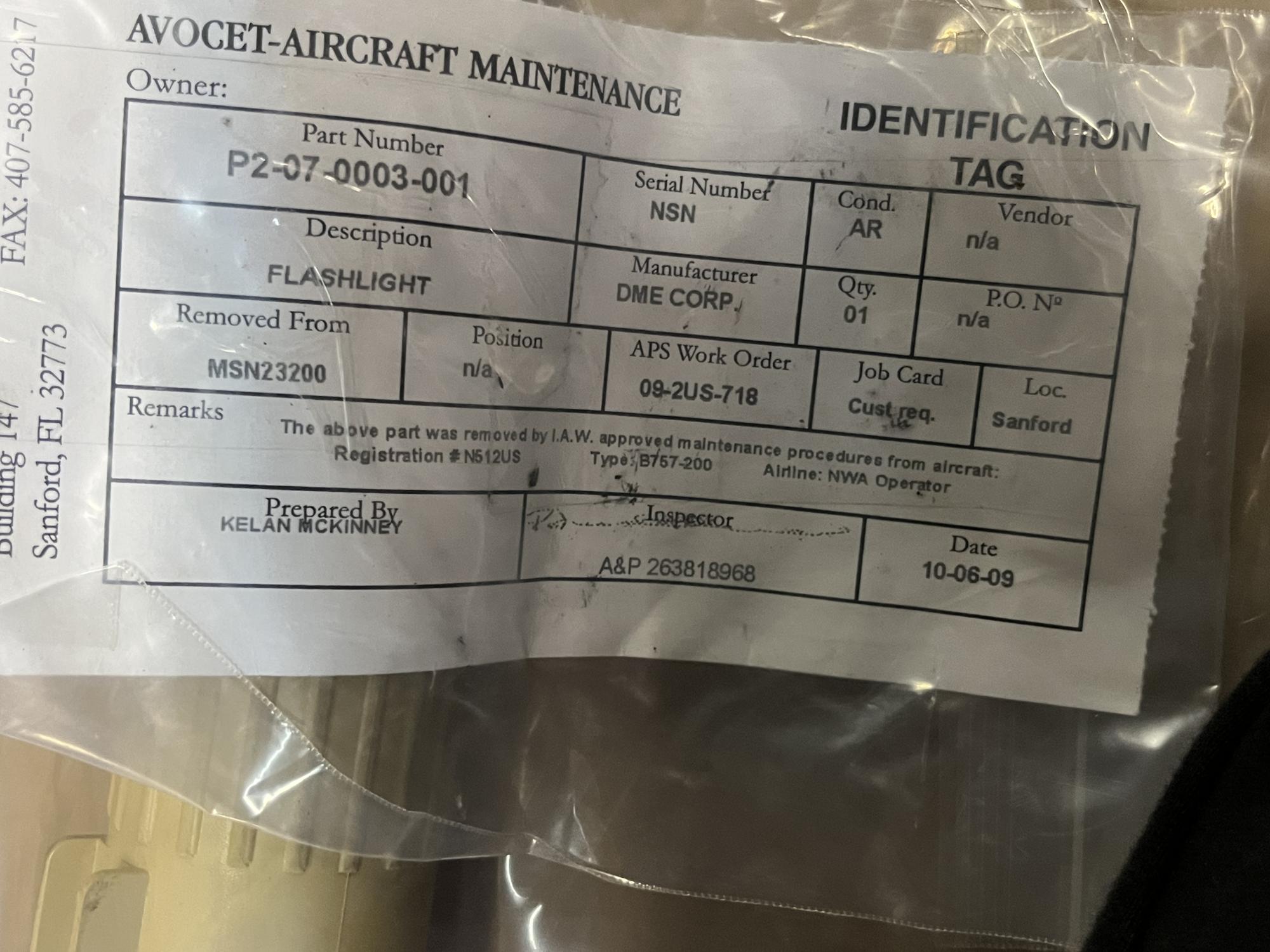 252 | P2-07-0003-001 | FLASHLIGHT ASSY, CREATES BEAM OF LIGHT, V55827 | 1 | AR | B757 | A23200 | SID19886 | View | |