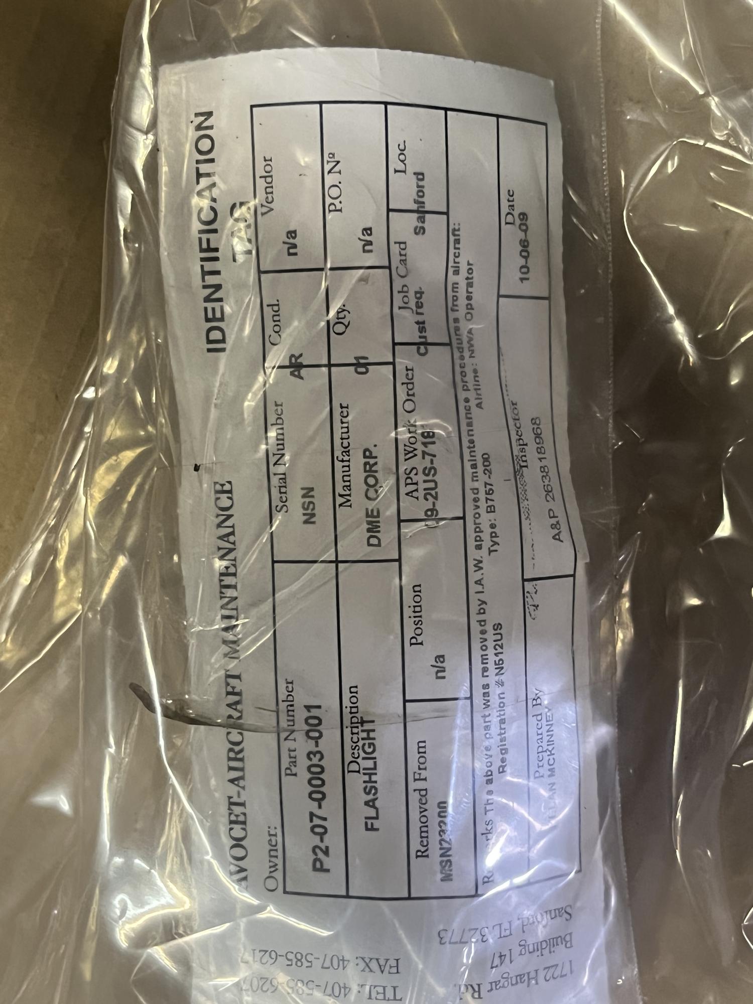 252 | P2-07-0003-001 | FLASHLIGHT ASSY, CREATES BEAM OF LIGHT, V55827 | 1 | AR | B757 | A23200 | SID19887 | View | |