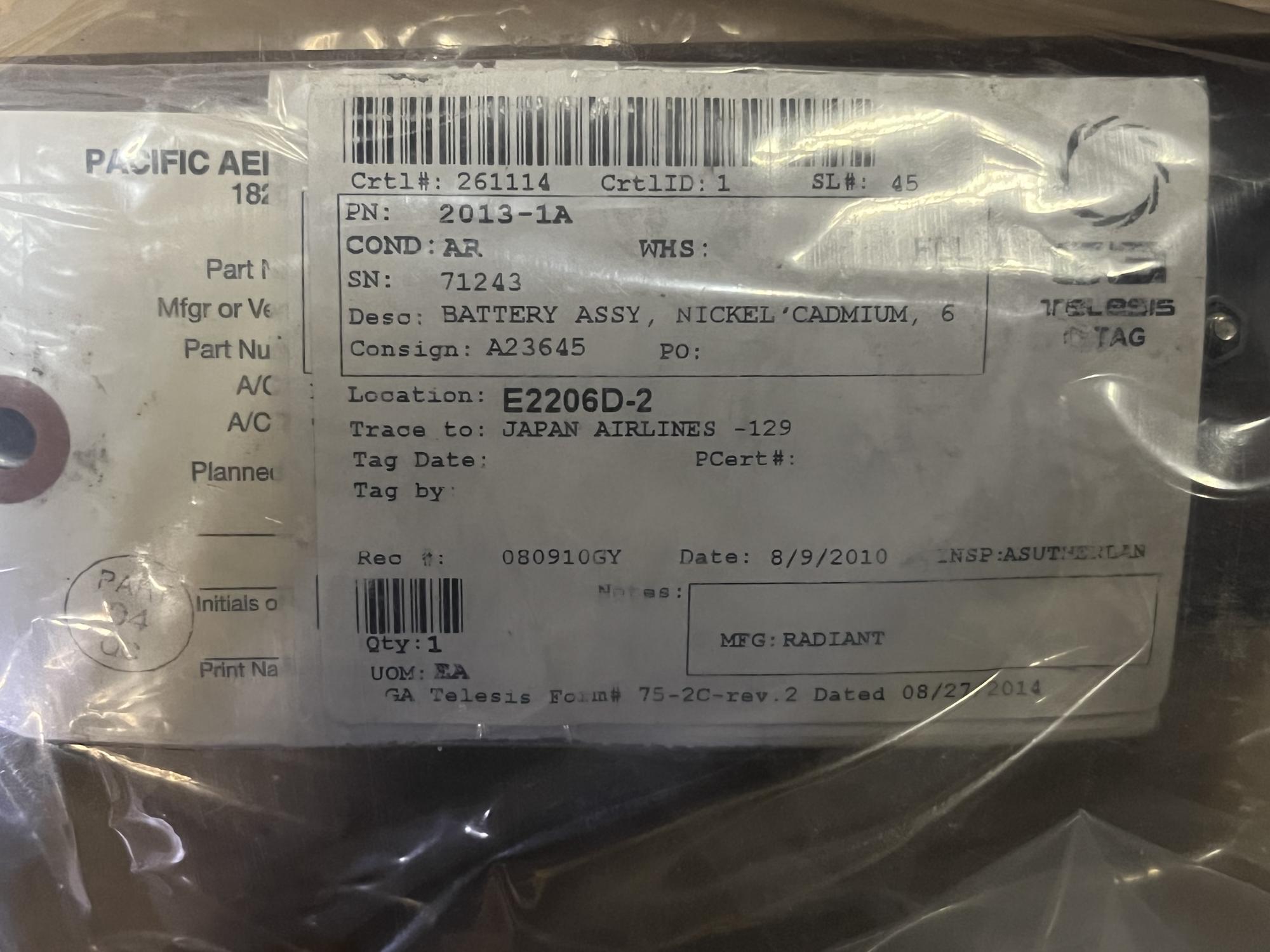 252 | 2013-1A | 71243 | BATTERY ASSY, NICKEL CADMIUM, 6 CELL, V60540 | 1 | AR | B767 | A23645 | SID01649 | View |