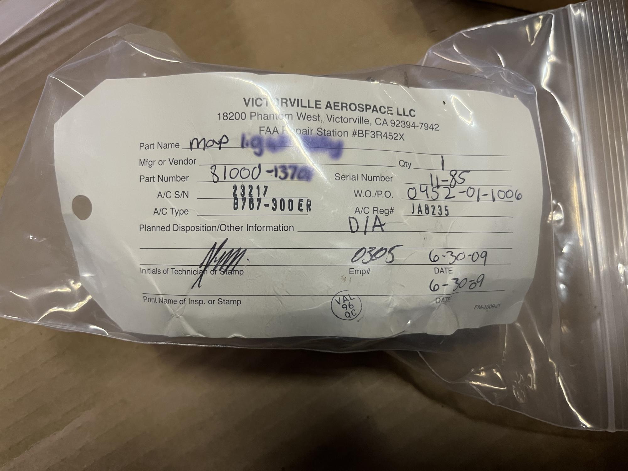 252 | 81000-13701 | 11-85 | LIGHT ASSY, MAP, FLIGHT DECK, VS5006 | 1 | AR | B767 | A23217 | SID15288 | View |