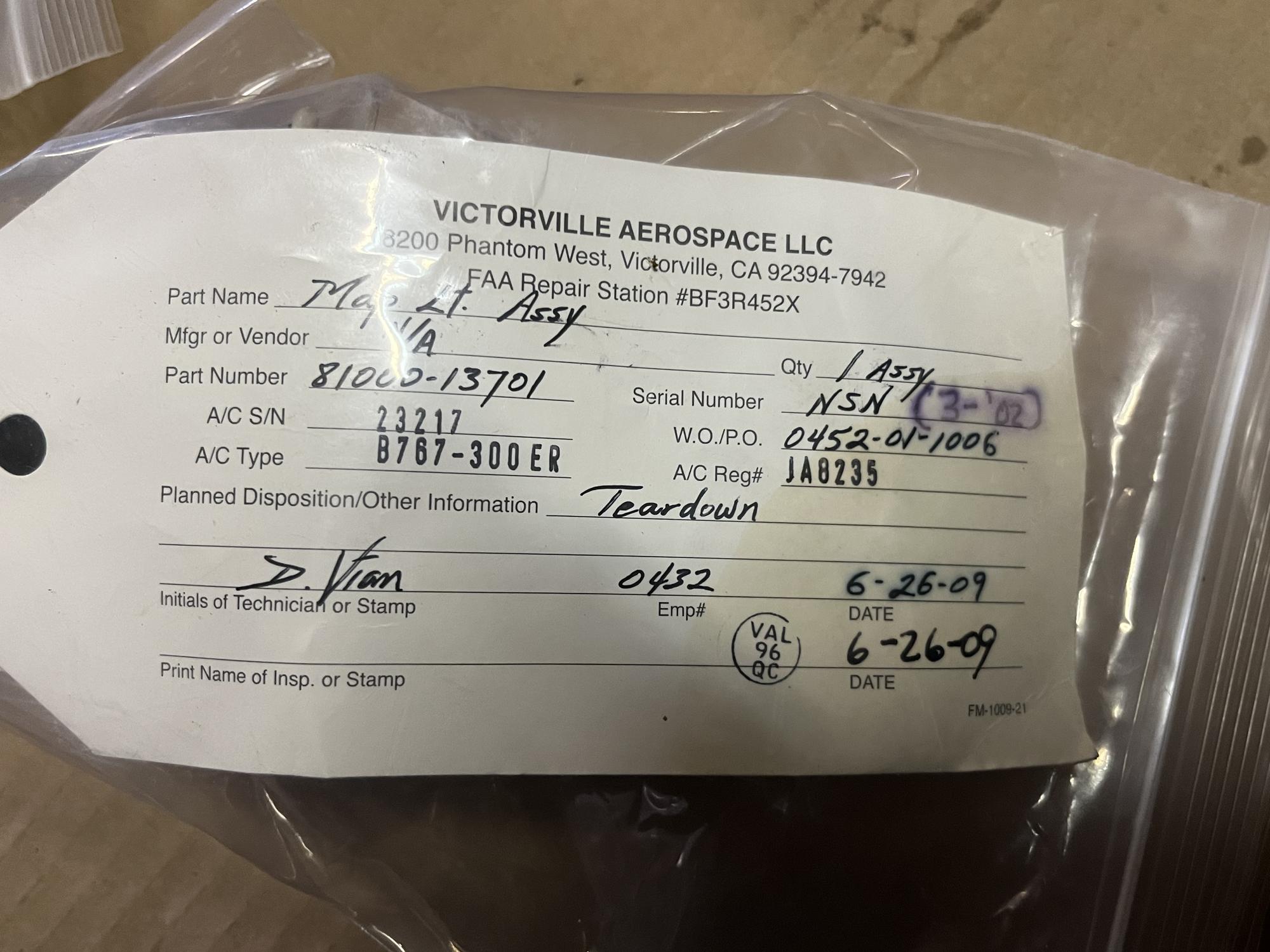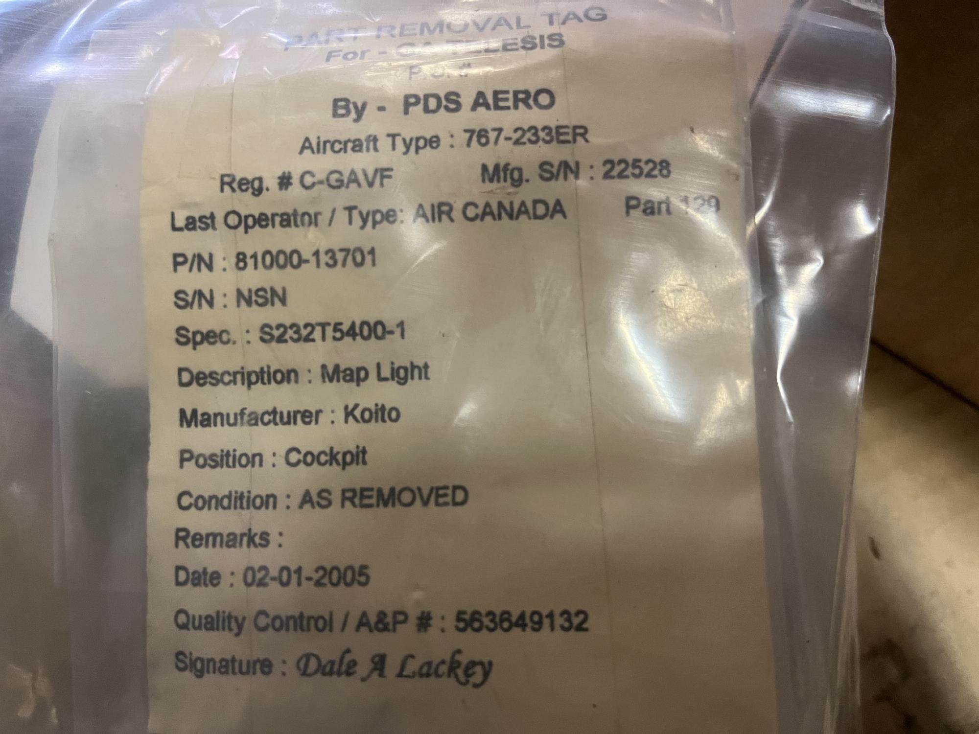 252 | 81000-13701 | NSN23726 | LIGHT ASSY, MAP, FLIGHT DECK, VS5006 | 1 | AR | B767 | A22528 | SID15291 | View |