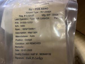 252 | 81000-13701 | NSN23668 | LIGHT ASSY, MAP, FLIGHT DECK, VS5006 | 1 | AR | B767 | A22528 | SID15290 | View |